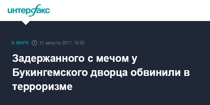Москва. 31 августа. INTERFAX.RU - Британская полиция предъявила обвинения в участии в подготовке теракта или терактов мужчине, которого задержали на прошлой неделе возле Букингемского дворца с мечом длиной 1,2 м в автомобиле. Об этом сообщает в четверг агентство Associated Press.