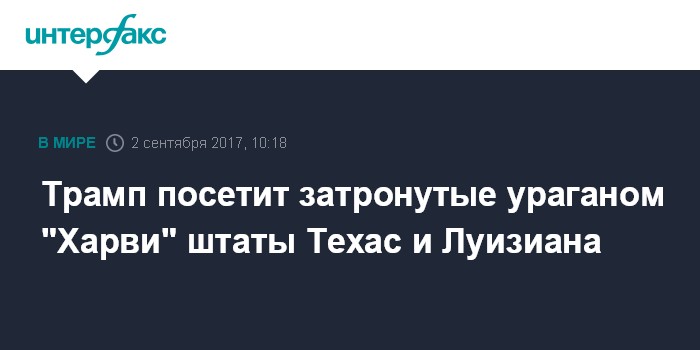 Москва. 2 сентября. INTERFAX.RU - Президент США Дональд Трамп в субботу прибудет с визитом в штаты Техас и Луизиана, которые пострадали от мощного урагана "Харви", передают в субботу американские СМИ.
