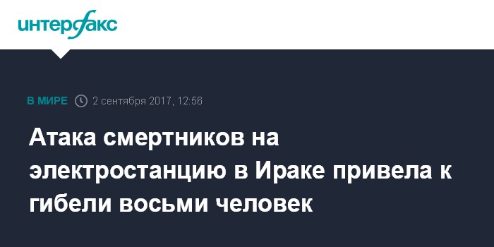 Москва. 2 сентября. INTERFAX.RU - По меньшей мере восемь человек стали жертвами нападения семи террористов-смертников на электростанцию, расположенную в иракском городе Самарра к северу от Багдада, передают в субботу западные СМИ.