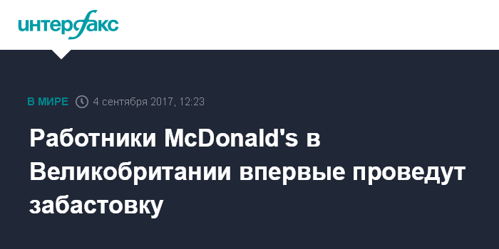 Москва. 4 сентября. INTERFAX.RU - Работники McDonald's в Великобритании выйдут на забастовку впервые с 1974 года, когда компания начала работать в стране, протестуя против низкой оплаты труда и отсутствия гарантий трудоустройства, пишет The Guardian.