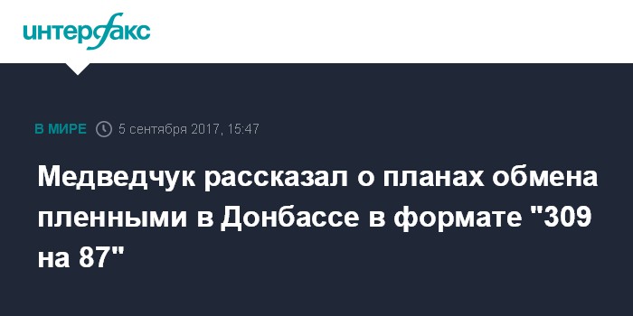 Москва. 5 сентября. INTERFAX.RU - Спецпредставитель по гуманитарным вопросам в рамках контактной группы по мирному урегулированию ситуации на юго-востоке Украины Виктор Медведчук сообщил о подготовке масштабного обмена пленными в Донбассе.