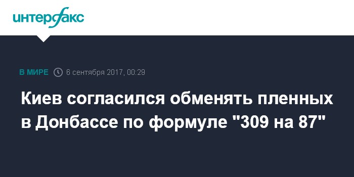 Москва. 6 сентября. INTERFAX.RU - Вопрос обмена пленными будет обсуждаться в среду на очередном заседании контактной группы по Донбассу, Украина готова передать 309 пленных в обмен на 87 человек, удерживаемых в Донецке и Луганске, сообщил советник главы Службы безопасности Украины Юрий Тандит.