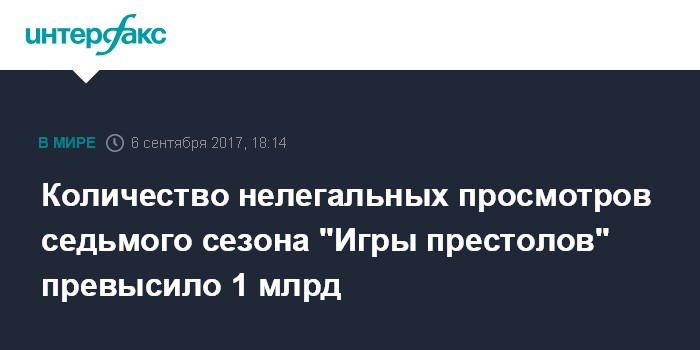 Москва. 6 сентября. INTERFAX.RU - Количество просмотров с нарушением авторских прав седьмого сезона телесериала "Игра престолов", выходившего в эфир летом 2017 года, превысило один миллиард, сообщила британская газета The Independent со ссылкой на компанию MUSO, занимающуюся защитой информации.