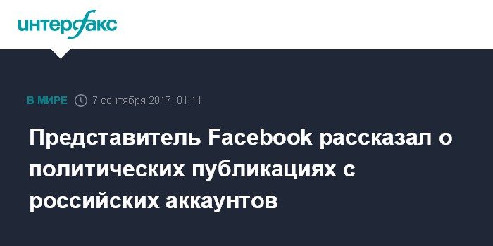 Москва. 7 сентября. INTERFAX.RU - Начальник службы безопасности социальной сети Facebook Алекс Стамос выступил в среду с утверждением о том, что якобы с июня 2015 по май 2017 года с помощью примерно 470 недостоверных учетных записей и страниц были распространены тысячи сообщений политического характера.