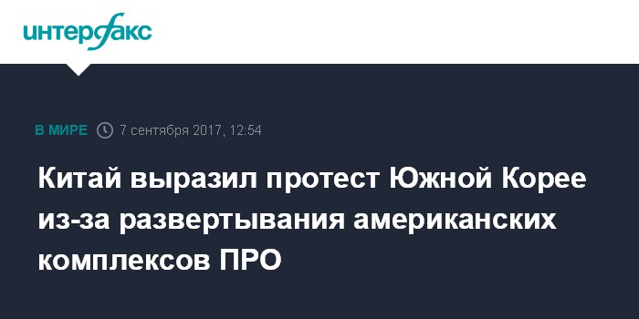 Москва. 7 сентября. INTERFAX.RU - Китай выразил протест дипломатический протест Южной Корее из-за решения Сеула о размещении в стране дополнительных американских комплексов ПРО THAAD, сообщают западные СМИ.