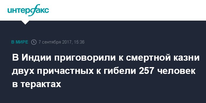 Москва. 7 сентября. INTERFAX.RU - Индийский суд приговорил к смертной казни двух мужчин, признанных виновными в причастности к серии взрывов в городе Мумбаи, в результате которых в 1993 году погибли 257 человек, сообщают в четверг местные СМИ.