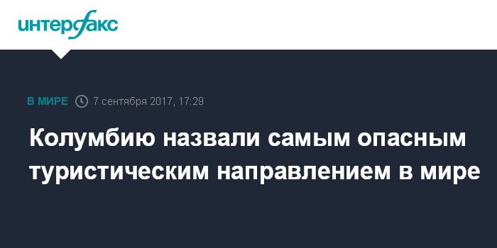 Москва. 7 сентября. INTERFAX.RU - Колумбия заняла последнее место в списке стран мира по безопасности для туристов, сообщает в четверг сайт британской газеты The Independent со ссылкой на доклад Всемирного экономического форума (ВЭФ).