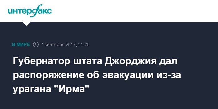 Москва. 7 сентября. INTERFAX.RU - Губернатор штата Джорджия Нейтан Дил дал распоряжение об обязательной эвакуации прибрежных районов штата, включая город Саванна, в преддверии удара урагана "Ирма", сообщило в четверг агентство AP.