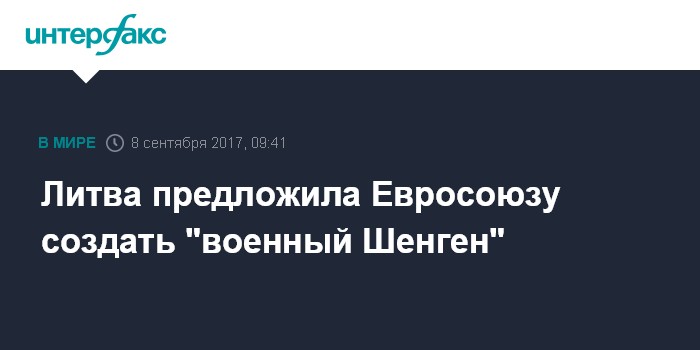 Москва. 8 сентября. INTERFAX.RU - Литва призывает руководство Евросоюза создать "военную Шенгенскую зону", чтобы оперативно перебрасывать войска по территории Европы, сообщает Министерство обороны страны.