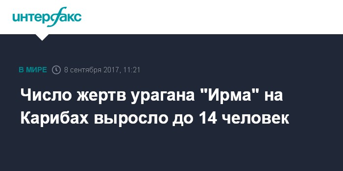 Москва. 8 сентября. INTERFAX.RU - По меньшей мере 14 человек погибли в результате урагана "Ирма", обрушившегося на острова Карибского бассейна, передает в пятницу телеканал Sky News.