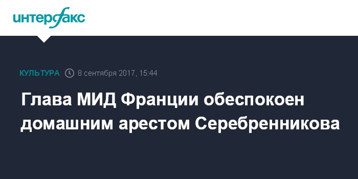 "Нас беспокоит ситуация, связанная с режиссером, который внес важный вклад в развитие культурного взаимодействия между нашими странами. Поэтому его домашний арест, о котором было объявлено в прошлый понедельник (4 сентября суд отклонил жалобу на домашний арест Серебренникова - ИФ), нас беспокоит, волнует, и мы об этом говорим публично", - заявил журналистам глава МИД Франции Жан-Ив Ле Дриан.