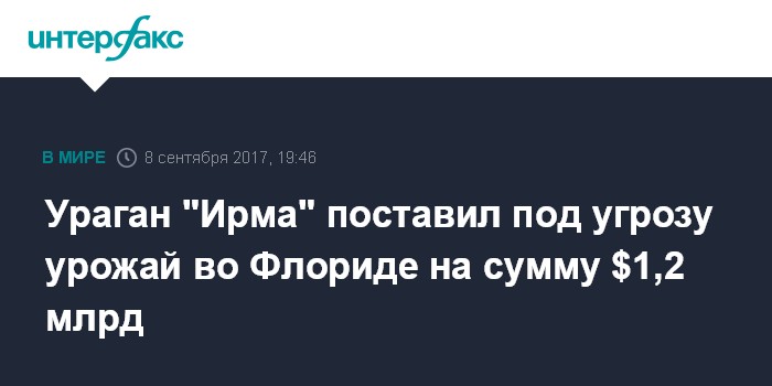 Москва. 8 сентября. INTERFAX.RU - Ураган "Ирма", приближающийся к Флориде, может уничтожить урожай сельскохозяйственных культур на сумму до $1,2 млрд, сообщает агентство Bloomberg.