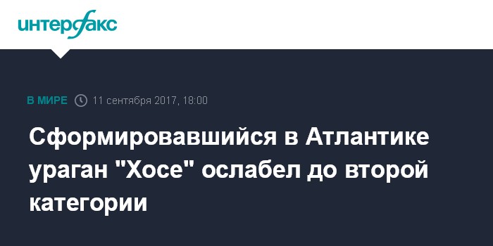 Москва. 11 сентября. INTERFAX.RU - Национальный центр США по предупреждению ураганов понизил в понедельник категорию урагана "Хосе", эпицентр которого на данный момент находится в 400 км от острова Гранд-Терк в Саргассовом море, до второй по пятибалльной шкале Саффира-Симпсона, сообщают американские СМИ.