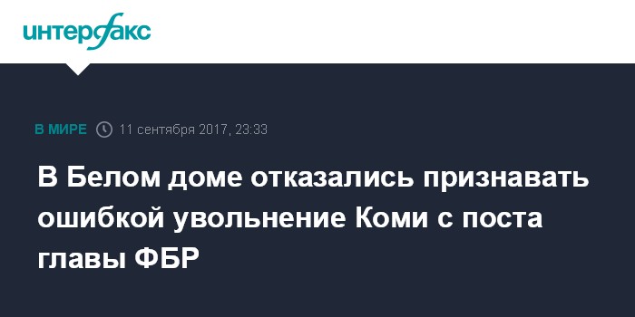Москва. 11 сентября. INTERFAX.RU - В администрации США по-прежнему считают, что правильно поступили, уволив Джеймса Коми с поста директора ФБР, заявила в понедельник представитель Белого дома Сара Сандерс.