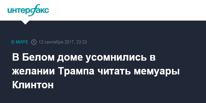Москва. 12 сентября. INTERFAX.RU - Пресс-секретарь Белого дома Сара Сандерс не знает наверняка, прочтет ли президент США Дональд Трамп книгу Хиллари Клинтон "Что произошло" ("What happened"), так как он в курсе того, что происходило во время избирательной кампании 2016 года.