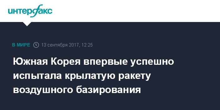 Москва. 13 сентября. INTERFAX.RU - Военные Южной Кореи в среду впервые провели учебные стрельбы крылатой ракетой большой дальности, запущенной с самолета, сообщает южнокорейский телеканал YTN со ссылкой на ВВС страны.