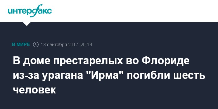 Москва. 13 сентября. INTERFAX.RU - Шесть человек, которые находились в доме престарелых, погибли в американском штате Флорида в результате удара урагана "Ирма". Об этом сообщает в среду агентство Associated Press.