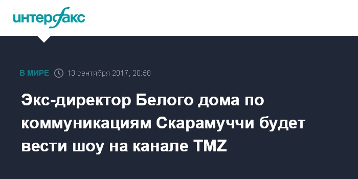 Москва. 13 сентября. INTERFAX.RU - Финансист Энтони Скарамуччи, проработавший на посту директора по коммуникациям Белого дома в течение 10 дней, будет соведущим программы новостей развлекательного характера TMZ Live. Об этом сообщает в среду издание The Hill.