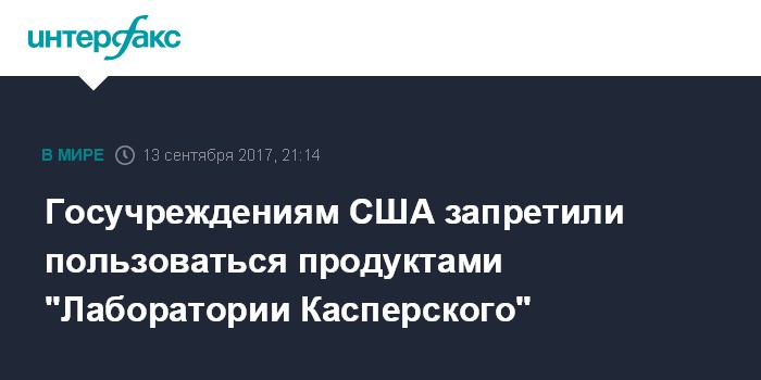Москва. 13 сентября. INTERFAX.RU - Министерство внутренней безопасности США запретило государственным учреждениям страны пользоваться программным обеспечением российской "Лаборатории Касперского" из-за опасений, что эта компания "может быть связана с организованным другим государством кибершпионажем", сообщает в среду The Washington Post.