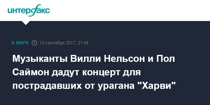 Москва. 13 сентября. INTERFAX.RU - Композитор и певец Вилли Нельсон, рок-музыкант Пол Саймон, фолк-музыкант и автор песен Джеймс Тейлор, а также певица Бонни Рэйтт и многие другие музыканты дадут благотворительный концерт в Остине, выручка от которого будет направлена пострадавшим от урагана "Харви", ударившего по юго-восточному побережью США, сообщает Rolling Stone.