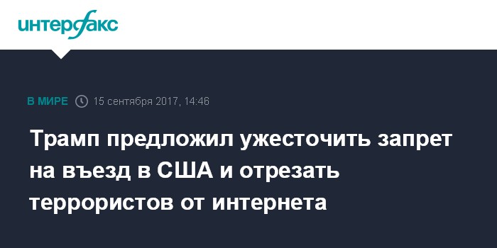 Москва. 15 сентября. INTERFAX.RU - Запрет на въезд в США для иностранных граждан должен быть гораздо более жестким, заявил президент США Дональд Трамп в пятницу, комментируя террористическую атаку в лондонском метро.