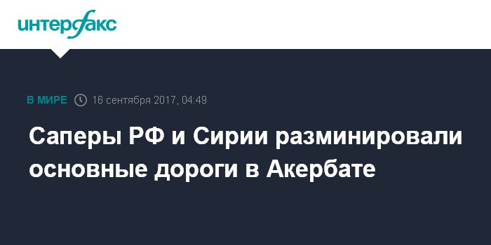 Москва. 16 сентября. INTERFAX.RU - Российские и сирийские саперы разминировали основные дороги в городе Акербате, освобожденном от боевиков в начале сентября, сообщил в пятницу начальник штаба группировки войск Вооруженных сил России в Сирии генерал-лейтенант Александр Лапин.