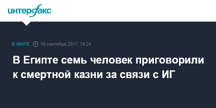 Москва. 16 сентября. INTERFAX.RU - В Египте суд приговорил семь человек к смертной казни за связь с ливийским подразделением террористической организации "Исламское государство" (ИГ, запрещена в России), сообщает в субботу агентство Associated Press.