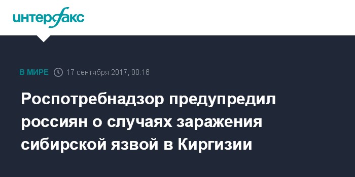 Москва. 17 сентября. INTERFAX.RU - Три случая заболевания людей кожной формой сибирской язвы зафиксировано в Киргизии, Роспотребнадзор призывает россиян учитывать данную информацию при планировании поездок.