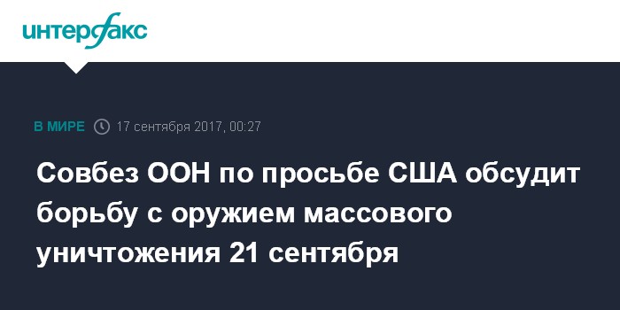 "США вышли в СБ ООН с инициативой о проведении заседания Совета 21 сентября во время сегмента высокого уровня 72-й сессии Генеральной Ассамблеи ООН, посвящённого борьбе с распространением оружия массового уничтожения", - сказал собеседник агентства.