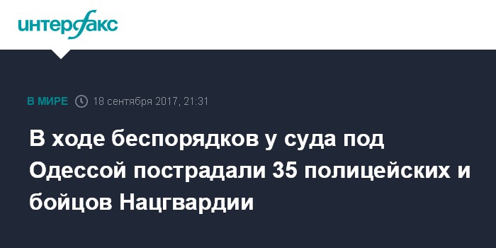 Москва. 18 сентября. INTERFAX.RU - В результате столкновения активистов украинских организаций с сотрудниками правоохранительных органов у здания Ильичевского городского суда (Черноморск, Одесская область) пострадали около 20 полицейских и 15 бойцов Национальной гвардии, открыто уголовное производство по статье "хулиганство", сообщает Министерство внутренних дел Украины.