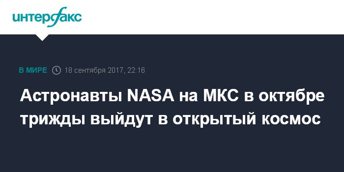 Москва. 18 сентября. INTERFAX.RU - Астронавты NASA трижды выйдут с борта Международной космической станции (МКС) в открытый космос в октябре, сообщает NASA в своем блоге.