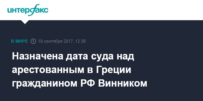 Москва. 19 сентября. INTERFAX.RU - Суд над арестованным в Греции гражданином РФ Александром Винником, как ожидается, пройдет 29 сентября, сообщил во вторник "Интерфаксу" генеральный консул Александр Щербаков.