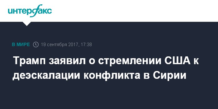 Москва. 19 сентября. INTERFAX.RU - Власти США поддерживают идею деэскалации сирийского конфликта и поиски его политического решения, заявил американский президент Дональд Трамп.