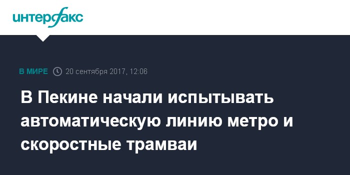 Москва. 20 сентября. INTERFAX.RU - Пекин в среду начал испытания сразу трех железнодорожных линий: ветки метрополитена с поездами без машинистов, поездов на магнитном подвесе (маглев) и скоростной трамвайной линии .