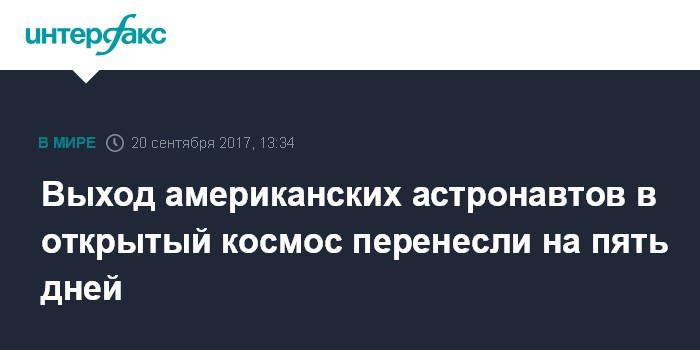 Москва. 20 сентября. INTERFAX.RU - Американские астронавты выйдут в открытый космос в октябре на пять дней позже запланированного, сообщил "Интерфаксу" источник в ракетно-космической отрасли.