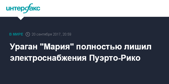 Москва. 20 сентября. INTERFAX.RU - Остров Пуэрто-Рико полностью лишился электроснабжения в результате удара урагана "Мария", обрушившегося на остров ранее в среду, сообщили западные СМИ.