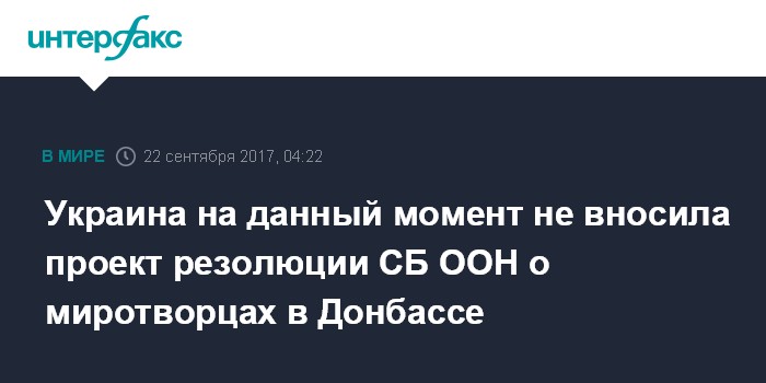 Ранее СМИ сообщили со ссылкой на источники, что Украина якобы внесла на рассмотрение Совета Безопасности ООН свой проект резолюции о миротворцах в Донбассе. По информации источников, украинская сторона внесла проект только после того, как свой вариант резолюции о миротворцах внесла в СБ ООН российская делегация.