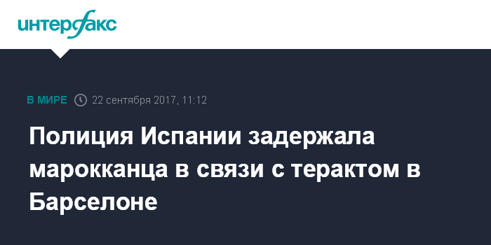 Москва. 22 сентября. INTERFAX.RU - Полиция Испании задержала выходца из Марокко в рамках расследования терактов в Барселоне и Камбрильсе, унесших жизни 16 человек. Об этом сообщил в пятницу в твиттере глава МВД страны Хуан Игнасио Соидо.