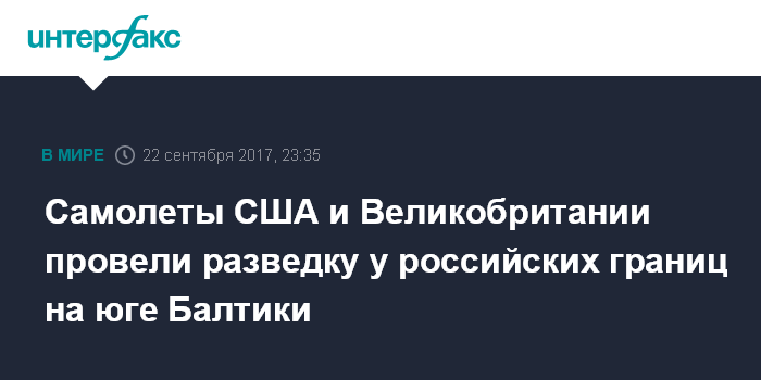 Москва. 22 сентября. INTERFAX.RU - Разведывательные самолеты ВВС США и Великобритании в пятницу совершили очередные полеты вблизи границ Калининградской области, свидетельствуют данные западных сайтов, отслеживающих передвижения военной авиации.