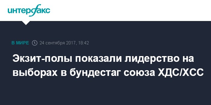 Москва. 24 сентября. INTERFAX.RU - Союз ХДС/ХСС, по данным экзит-полов, выходит на первое место в выборах в бундестаг, набирая 34% голосов, сообщает онлайн-портал немецкой газеты Bild.
