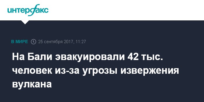 Москва. 25 сентября. INTERFAX.RU - На индонезийском острове Бали более 42 тысяч человек были эвакуированы из своих домов в связи с возросшей активностью вулкана Агунг, сообщает британская телерадиокорпорация "Би-би-си" со ссылкой на Красный Крест.