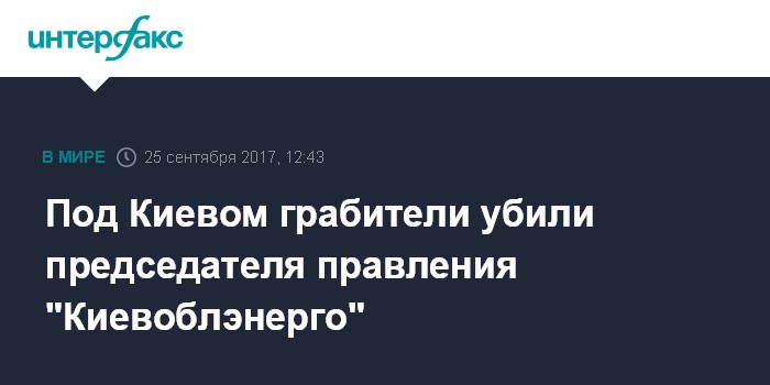 Москва. 25 сентября. INTERFAX.RU - Вечером 24 сентября в селе Белогородка Киево-Святошинского района неизвестные напали на дом председателя правления АО "Киевоблэнерго", нанесли телесные повреждения хозяину и его жене, в результате чего от полученных травм мужчина скончался.