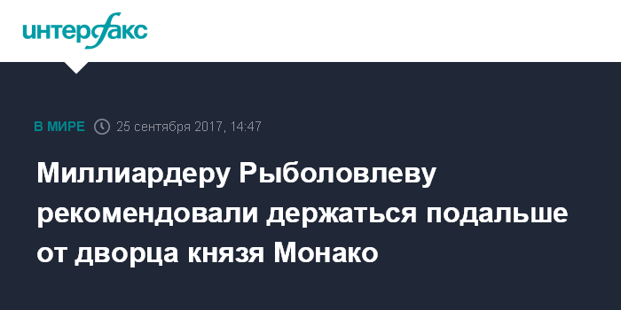 Москва. 25 сентября. INTERFAX.RU - Российскому бизнесмену Дмитрию Рыболовлеву, владельцу футбольного клуба "Монако", рекомендовано держаться подальше от дворца князя Монако, сообщает французское издание JDD.