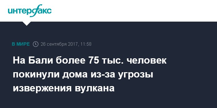 Москва. 26 сентября. INTERFAX.RU - На индонезийском острове Бали более 75 тысяч человек вынужденно покинули свои дома в связи с возросшей активностью вулкана Агунг, который может начать извергаться в любой момент. Об этом сообщило во вторник агентство Associated Press со ссылкой на индонезийские власти.