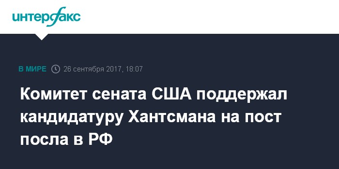 Москва. 26 сентября. INTERFAX.RU - Комитет сената США по иностранным делам во вторник одобрил кандидатуру Джона Хантсмана на пост посла Соединенных Штатов в России, сообщает агентство Bloomberg.