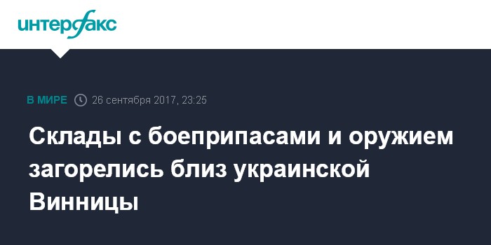 Москва. 26 сентября. INTERFAX.RU - Взрывы на складах с боеприпасами и оружием начались из-за пожара в военной части в Калиновском районе Винницкой области Украины, сообщает телеканал "112.Украина".