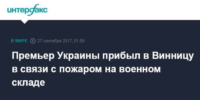 "Премьер-министр Украины Владимир Гройсман прибыл в Винницкую область с целью выяснить обстоятельства и взять под личный контроль ликвидацию чрезвычайной ситуации, которая возникла в результате пожара на военных складах в Калиновке Винницкой области. Мобилизован ресурс всех соответствующих служб для обеспечения безопасности людей, оказавшихся в опасной зоне", - говорится в сообщении, обнародованном пресс-службой в ночь на среду.