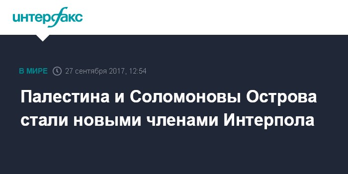 Москва. 27 сентября. INTERFAX.RU - Международная организация уголовной полиции (Интерпол) в среду сообщила о принятии в свои ряды двух новых участников - Палестины и Соломоновых Островов.