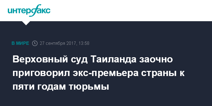 Москва. 27 сентября. INTERFAX.RU - Верховный суд Таиланда в среду заочно приговорил бывшего премьер-министра страны Йинглак Чинават к лишению свободы сроком на пять лет, сообщает агентство AP.