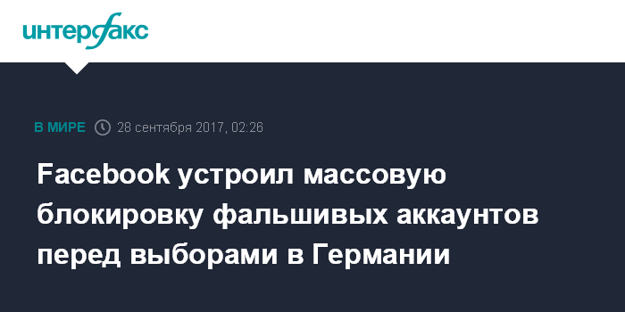 Москва. 28 сентября. INTERFAX.RU - За месяц до выборов в бундестаг в Германии компания Facebook заблокировала "десятки тысяч фейковых аккаунтов" в Германии, говорится в сообщении вице-президента по связям с общественностью по странам Европы, Ближнего Востока и Азии компании Facebook Ричарда Аллана.